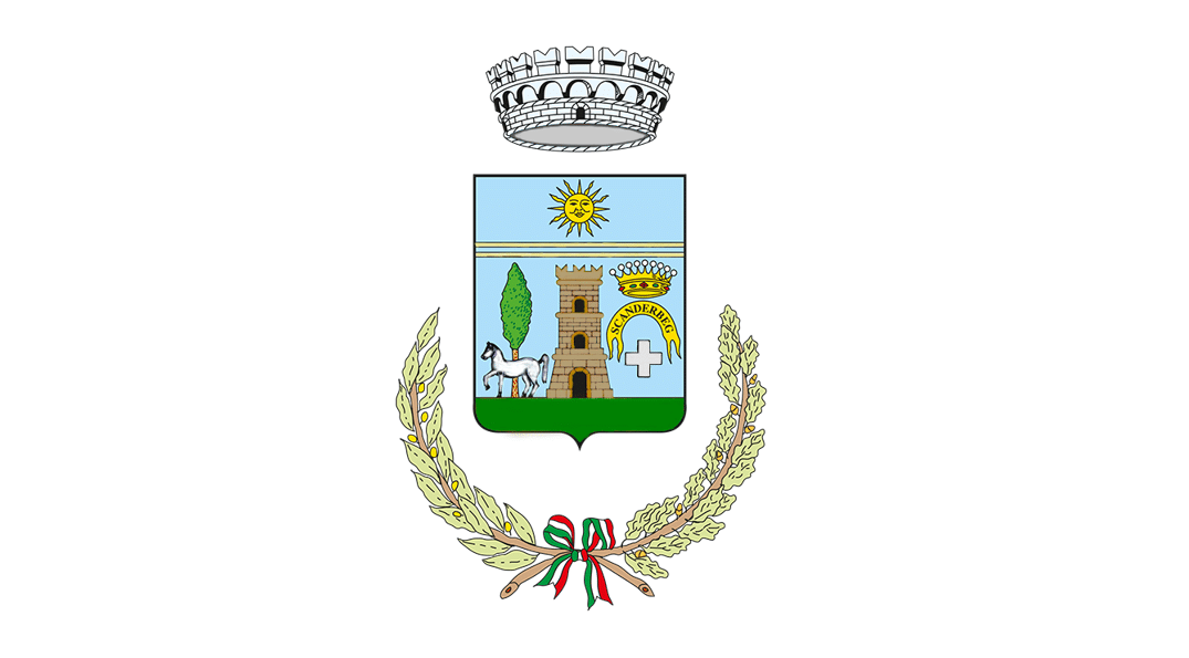 contrada soleggiata”. Nella parte inferiore, invece, troviamo una zolla di terra che richiama alla terra fertile, grazie alla quale si sviluppa l’agricoltura, importantissima per il territorio. Sopra il terreno si trovano poi numerosi elementi: il cavallo bianco dell’eroe albanese Giorgio Castriota Scanderbeg, che è anche lo stemma di famiglia di Cesare Masi (primo sindaco e capitano). Dietro al cavallo un cipresso, a cui si dice che il figlio di Scanderbeg avrebbe legato il cavallo del padre prima di partire per scappare dai Turchi, con la madre e altri, verso l’Italia. Al centro troviamo la torre merlata, simbolo dei Conti Moncada, che concedettero il territorio; a seguire c’è la croce greca, che indica l’appartenenza dei padri fondatori alla fede cristiana di rito greco; sopra di essa il nastro d’oro con la scritta “Scanderbeg”, è per celebrare Giorgio