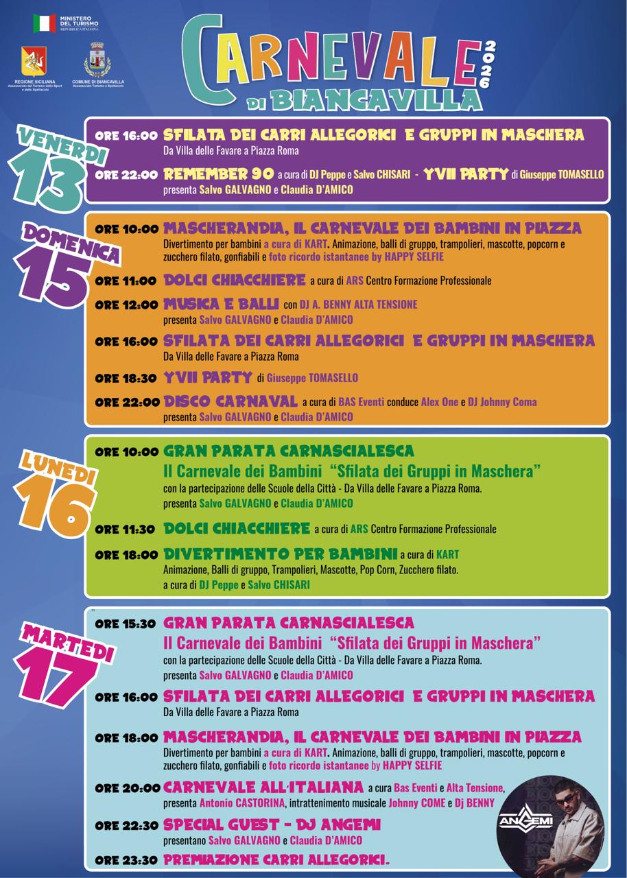 Al via al programma per le Manifestazioni Carnascialesche, che si terranno nei giorni 13, 15, 16 e 17 Febbraio 2026. Un ricco ventaglio di eventi che avranno luogo a Biancavilla, lungo Via Vittorio Emanuele (zona Villa delle Favare) fino ad arrivare in Piazza Roma.